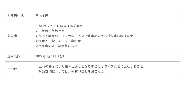 そして今般、一部の部門及び部門内職種を対象として、原則会社に出社せず日本全国の好きな場所に居住し勤務できる制度を導入いたしました。本制度の対象外となる部門や職種においては、コロナ禍でも実施してきたハイブリッドな働き方を継続いたします。