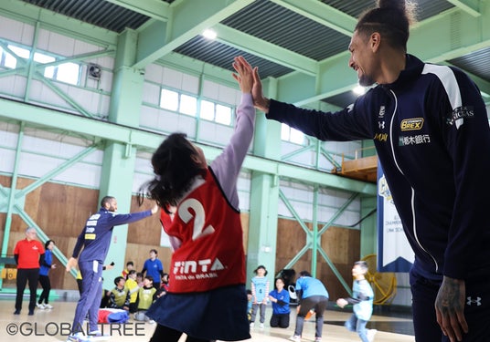 身長2メートル前後の「#25 D.J・ニュービル」選手、「#33 ギャビン・エドワーズ」選手、「#42 アイザック・フォトゥ」選手がフリースローや3ポイントシュート、ダンクシュートを披露し、目の前で繰り広げられるプロの選手たちの姿に、自然と子どもたちの笑顔が溢れ、会場は活気に包まれました。