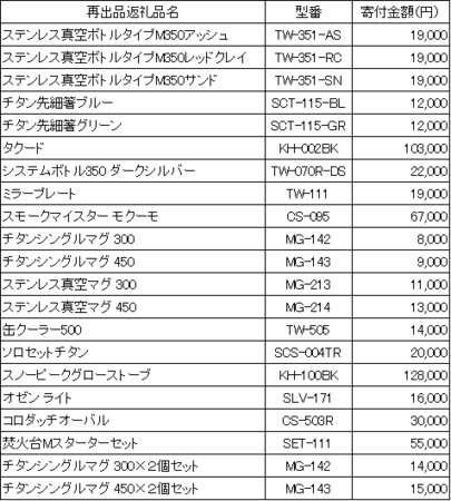 昨年は、「チタンシングルマグ」シリーズの11月18日(木)の先行出品を皮切りに、以後11月25日、12月10、15、27日の5回にわたり新規の返礼品を織り交ぜながら人気返礼品の追加出品を行いましたが、いずれも、ほぼ即日に品切れとなりました。