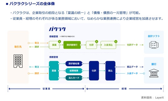 LayerX社が提供するクラウドサービスの「バクラク」シリーズは、請求書処理、経費精算、法人カードなどの支出管理を
