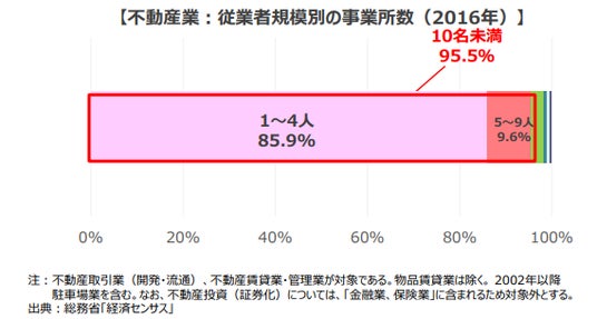 日本における不動産業に従事する従業者規模で見ると「4人以下の小規模事業者」が全体の85%以上を占めており「9人以下」の場合95%以上を占める。(総務省「経済センサス」より)人的リソースの不足やデジタル対応の遅れといった課題を多く抱えています。