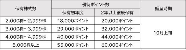 長期保有特典 : 8月20日の当社株主名簿に同一株主番号で連続2回以上記載され、かつ20単元(2,000株)以上継続保有されている株主様へは長期保有特典のご対象として、株主優待ポイント表内にあります「2年以上継続保有」に記載のポイントを贈呈いたします。