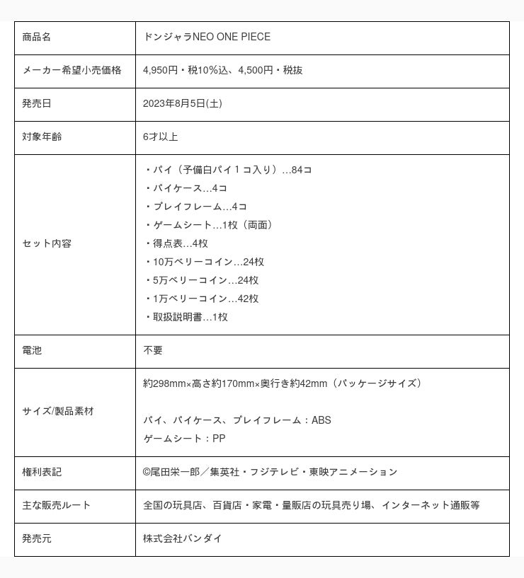 株式会社バンダイ トイディビジョンは、今年でシリーズ43周年を迎えるファミリーゲーム「ドンジャラ」シリーズの最新作として、大人気TVアニメ『ONE PIECE(ワンピース)』のキャラクターたちがパイになったドンジャラ「ドンジャラNEO ONE PIECE」(4,950円・税10%込、4,500円・税抜)を2023年8月5日(土)に発売します。