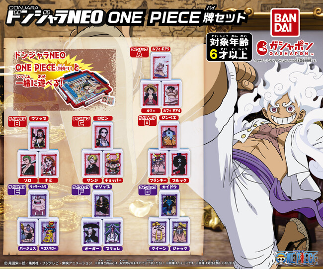 本商品は、キャラクターの“パイ”を集め、組み合わせることで点数を競う「ドンジャラ」を人気テレビアニメ『ONE PIECE』の世界感を楽しみながら遊べる商品です。