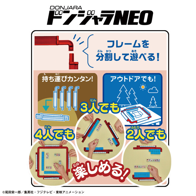 また、本商品はフレームが取り外せてコンパクトに収納可能・持ち運びしやすい新フォーマット「ドンジャラNEO」シリーズで発売いたします。パッケージサイズは幅約298mm×高さ約170mm×奥行き約42mmと従来のドンジャラシリーズよりコンパクトなのでいつでも、どこでも、仲間と一緒にドンジャラを楽しむことができます。