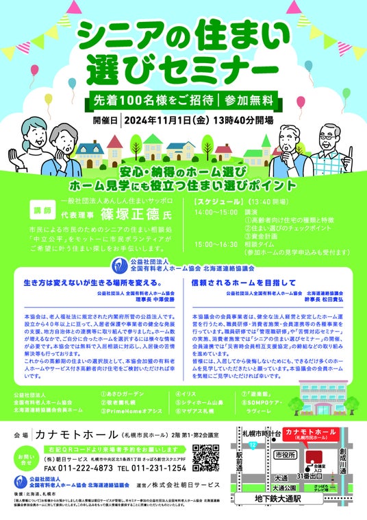 公益社団法人全国有料老人ホーム協会 北海道連絡協議会が、2024年11月1日(金)に「シニアの住まい選びセミナー」(会場:カナモトホール、後援:北海道、札幌市)を開催いたします。