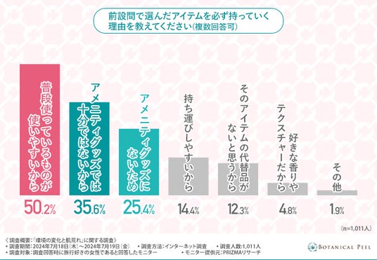 「前設問で選んだアイテムを必ず持っていく理由を教えてください(複数回答可)」と質問したところ、『普段使っているものが使いやすいから(50.2%)』と回答した方が最も多く、『アメニティグッズでは十分ではないから(35.6%)』『アメニティグッズにないため(25.4%)』と続きました。