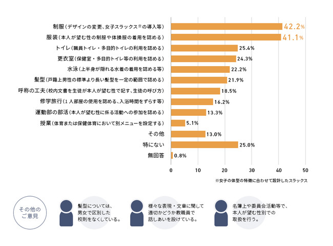 ・LGBTQの生徒への配慮は制服デザインの変更や女子スラックス(※)の導入など「制服」に関してが42.2%で最多。