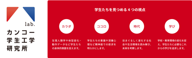 子どもたちを「カラダ」「ココロ」「時代」「学び」の4つの視点で見つめるカンコーの「学生工学」という考え方。この考えのもと基礎研究を行い、時代性、子どもたちの成長、嗜好などを調査し、新たな価値を創出することが私たちカンコー学生工学研究所の使命です。