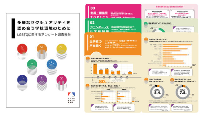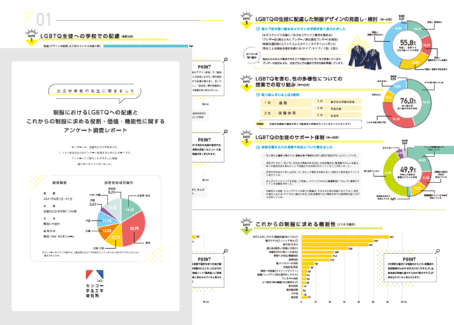 研究所では、「カラダ・ココロ・時代・学び」の4つの視点で学生を見つめ、調査・研究、商品・サービスの開発を行っております。LGBTQ・性の多様性に関しても、従来より調査・研究を行っており、教職員の方より多くのお問い合わせがありました。本レポートは、LGBTQの生徒への配慮や授業での取り組み状況、サポート体制などを調査し、学校教育をはじめ、広く社会で活用していただくために、菅公学生服の公式サイトにて無料ダウンロードしていただくことができます。