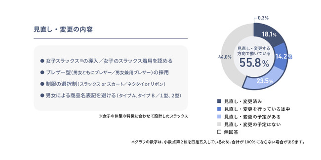 ・LGBTQの生徒のへの配慮で、半数以上の学校が制服のデザインの見直し・変更をする方向で動いている。