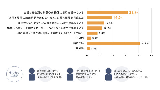 ●「自認する性別の制服・体操服の着用」(31.9%)や「衣替えの期間の見直し」(19.4%)など、現行制服の規定内で柔軟に対応している場合が多い。