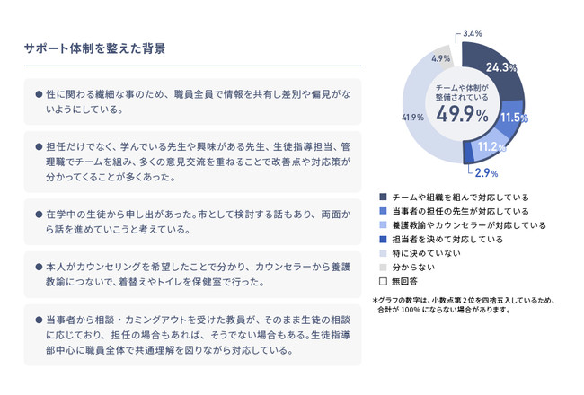 ・LGBTQの生徒へのサポート体制について、チームや体制が整備されていると回答したのは、49.9%。