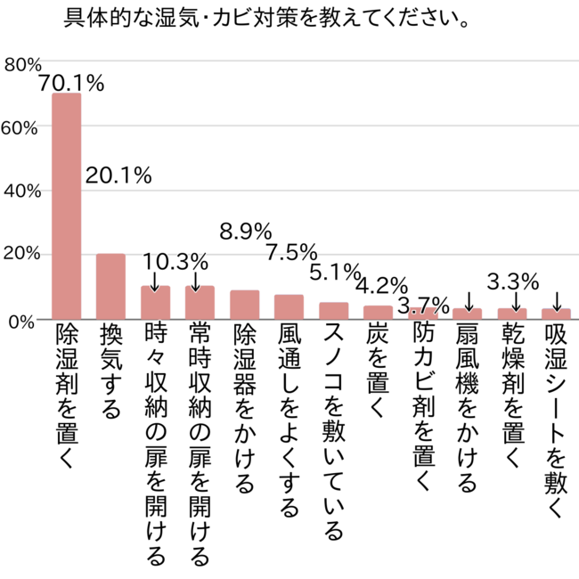 突出して多かった第1位は除湿剤を置く(70.1%)対策でした。スーパーやドラッグストアに売られている置き型の除湿剤を収納の隅に置いている方が非常に多いようです。