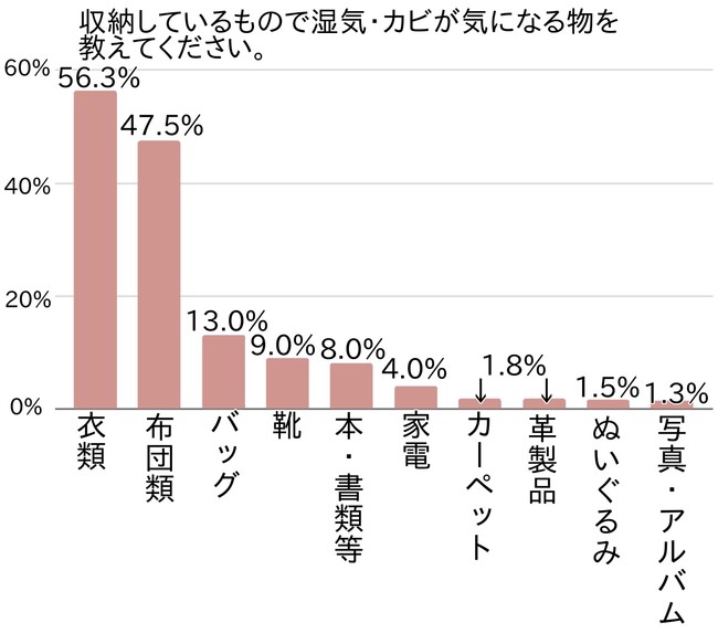ところで、具体的にどのような収納物について湿気やカビを気にしているのでしょうか。アンケートでは、湿気やカビから守りたいと思っている物は何か尋ねました。