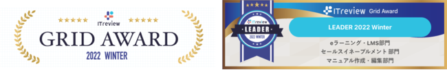 ユームテクノロジージャパン株式会社(本社:東京都渋谷区、代表取締役:松田しゅう平、以下、ユームテクノロジー)が提供するオンライン学習プラットフォーム「UMU(ユーム)」は、アイティクラウド株式会社(本社:東京都港区、代表取締役社長 兼 CEO:黒野 源太)が主催のアワード「ITreview Grid Award 2022 WINTER」にて、「eラーニング・LMS部門」「セールスイネーブルメント部門」「マニュアル作成・編集部門」それぞれにおいて満足度・認知度ともに優れた製品であると評価され、「Leader」を同時受賞いたしましたので、お知らせいたします。