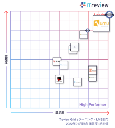 ITreview Grid Awardとは、ITreviewで投稿されたレビューをもとに四半期に一度ユーザーに支持された製品を表彰する場です。2021年12月までに掲載されたレビューの集計結果を2022 Winterとして発表されています。ITreview Grid(ユーザーレビューが10件以上の製品が1つ以上あれば表示)でユーザー評価の高い2領域を表彰しており、顧客満足度が高い製品(右図右下領域)が「High Performer」、顧客満足度と市場認知度の双方が高い製品(右図右上領域)が「Leader」として表彰されます。 「UMU(ユーム)」については、 「eラーニング・LMS部門」「セールスイネーブルメント部門」「マニュアル作成・編集部門」それぞれで「Leader」を受賞いたしました。
