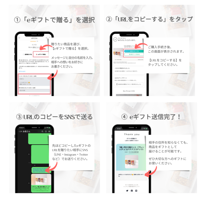 ギフトを贈る方は商品を選んで購入し、購入後に発行されるURLをLINEなどのSNSで相手にメッセージで送ります。贈られる方はURLから住所を入力し、ギフトを受け取ることができます。