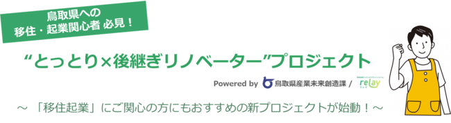 鳥取県では新たに事業承継マッチングプラットフォーム「relay」(リレイ)と連携し、後継者不在に悩む県内事業者と、鳥取県で新たな事業に挑戦しようとする方「後継ぎリノベーター」(※)を引き合わせ、「事業承継課題」の解決、また「事業承継型の起業」を普及、支援するプロジェクトを本年度から開始します。