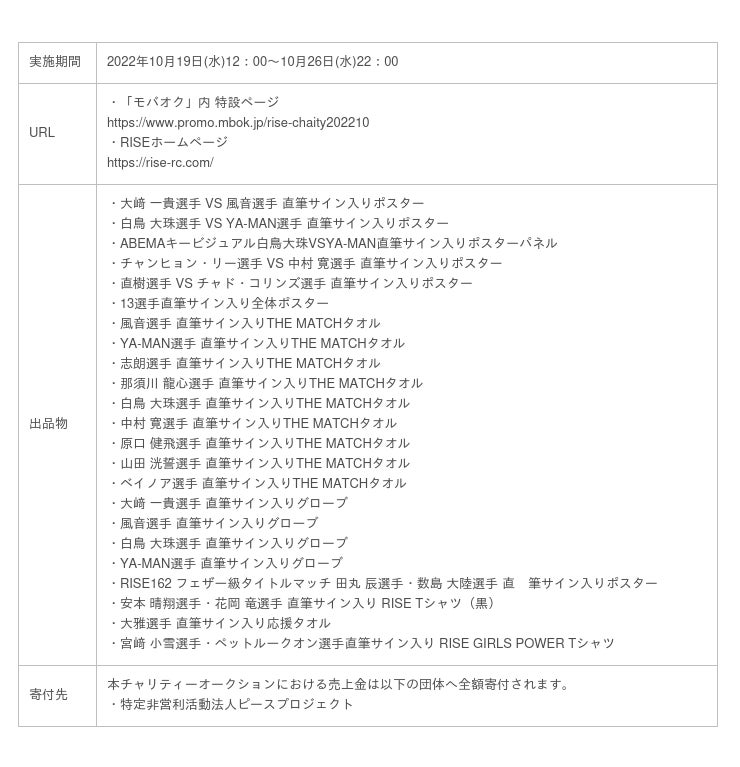 株式会社モバオク(本社:東京都渋谷区、代表取締役社長:生田目 知之、以下モバオク)が運営するオークションサービス「モバオク(https://www.mbok.jp/ )」は、RISEクリエーション株式会社(本社:東京都豊島区、代表取締役社長:伊藤 隆、以下RISE)が実施する「RISEスペシャルチャリティーオークション October2022」を2022年10月19日(水)から10月26日(水)まで開催します。