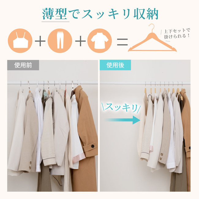薄型でかさばらず、クローゼットもすっきりキレイに収納できます。
