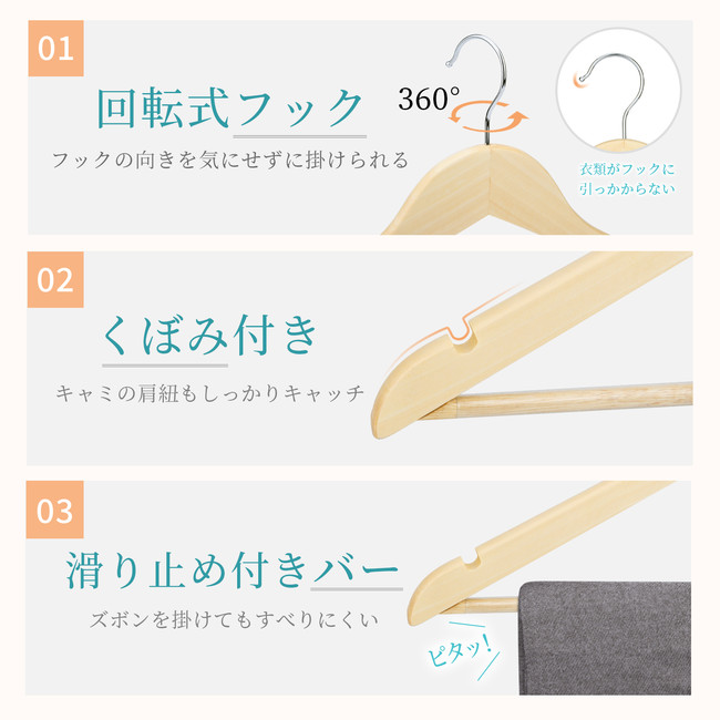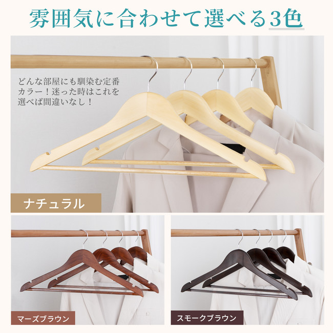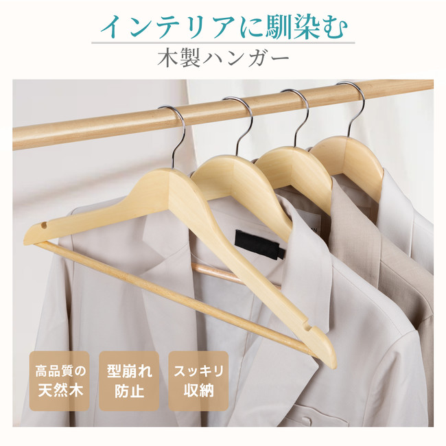 天然木ならではの自然な木目で、インテリアに馴染む木製ハンガーです。高級感があり、衣類の収納をおしゃれに楽しめます♪