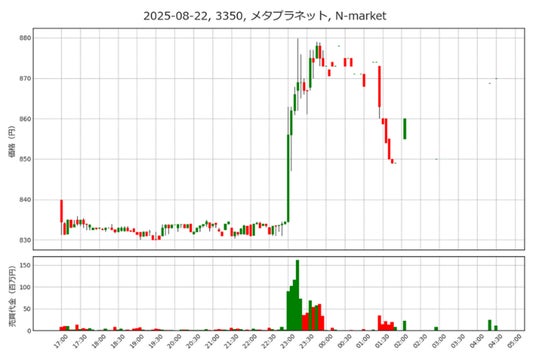 CAICAは従来の本業であったシステム開発で培ったノウハウを生かしブロックチェーン、暗号資産、Web3に展開してきた会社です。この時期は同社に対する評価が高まり、8月22日にストップ高、8月25日にも買い気配のままストップ高になりました。8月22日の夜間取引でCAICAは130~160円で取引されていましたが、8月25日の日中取引から参加した投資家は160円でしか買えなかった計算です。つまり、PTSの夜間取引が投資チャンスを広げたと言えます。この日のメタプラネットの夜間取引は当初830~840円近辺で推移していましたが、23時頃から880円に向けて急動意を示しています。ちなみに、メタプラネットの8月25日終値は904円であり、夜間から参加した投資家は利益を確保することができました。