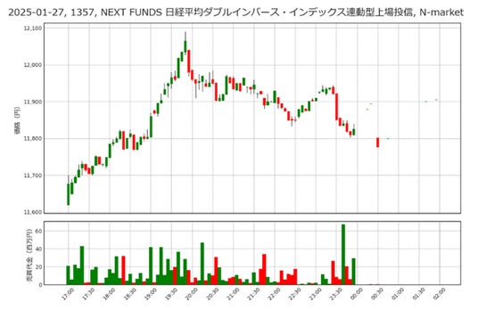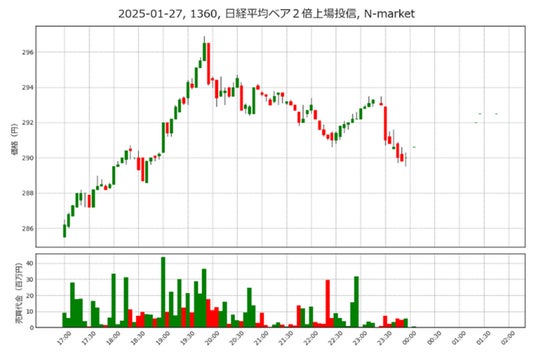 1月27日17:00~18:00(日本時間)に、米国市場は「Deep Seekショック」でテック株が急落し始めました。これにより、東京の夜間取引に直結する日経先物にも売り圧が入り、日経レバ(1570)が下落。この時点で日経ダブルインバース(1357)や日経平均ベア2倍(1360)は、“ショック相場対策”として買いが集中し、価格が上昇し始めます。18:00 (日本時間)以降、米国のプレマーケットではVIXの急騰などを受けて更なるリスク警戒が生じ、日経先物やETFにおいて売りが加速。 日経レバ(1570)は値を崩し、日経ダブルインバース(1357)は底値から逆に買われて直近安値圏から値を伸ばす展開に。