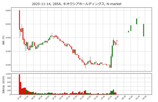2025年11月14日に売買代金が集中したのはキオクシア(285A)です。同社は東芝からスピンアウトしたNAND型フラッシュメモリの会社で半導体関連の一角を占めます。同社は11月13日取引終了後に中間決算を発表しましたが、市場予想には及びませんでした。それを受けて11月14日は3,000円安の10,025円まで下がるストップ安となりました。