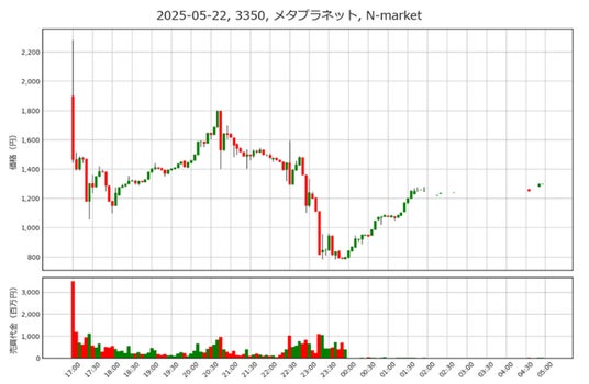 こうした中、代表的な暗号資産関連銘柄であるメタプラネットは5月22日まで3日連続ストップ高となりました。買いが多く5月22日は買い気配が切りあがったため、買い注文を残す形になりました。この日の夜間取引ではチャートにもあるように、メタプラネットは22日の終値から大きく乖離した価格帯での取引となりました。ここで注意すべき点は4点です