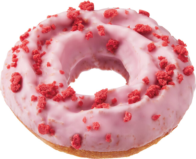 【内容】あまおうジャムとあまおうピューレを練り込んだドーナツ生地に、いちご風味のチョコレートと甘酸っぱいクランチをトッピングしました。
