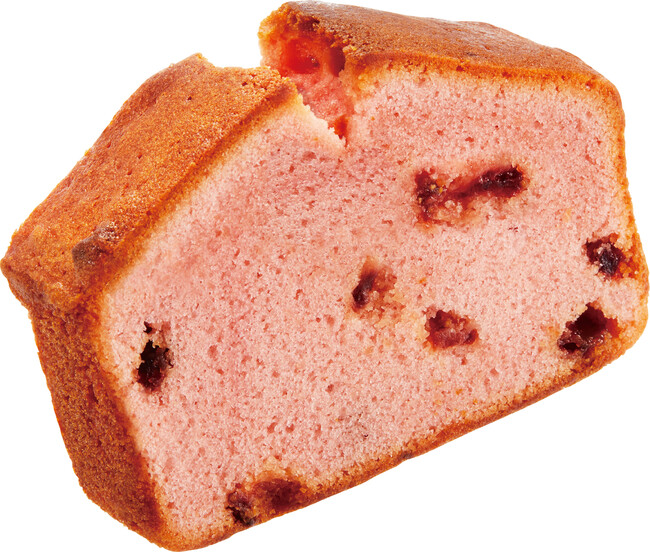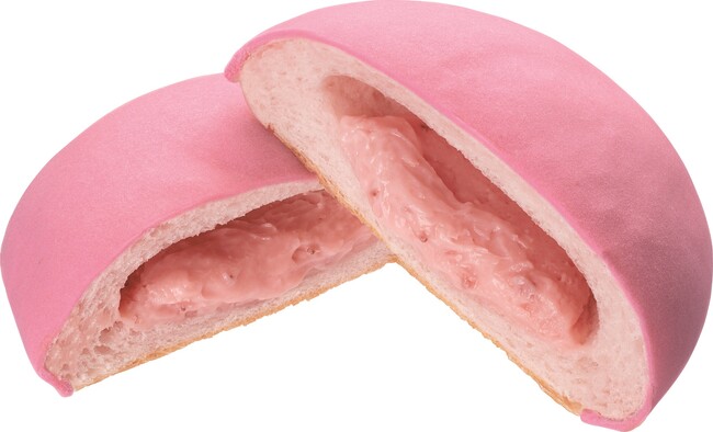 もちっとしたパン生地に鮮やかなピンクの生地をかぶせ、いちご果肉入りの甘酸っぱいいちごクリームを包んで焼き上げました。