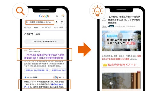 あわせて「〇〇市でおすすめの塗装業者」として紹介する記事を作成し、会社の強みや実績を分かりやすく発信。