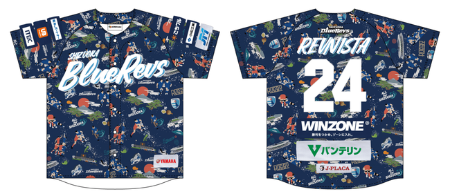 「ALL for SHIZUOKA」、そしてヤマハ発動機ジュビロ時代より大事にしている「5Hearts」の文字を盛り込んでいます。また、私たちのホストスタジアム「ヤマハスタジアム」「エコパスタジアム」「IAIスタジアム日本平」もデザインしています。そして背面にはレヴニスタナンバーである「背番号24」を。24番目の選手として、本節もそしてこの先も共に歩んでいただきたい、というメッセージを込めております。