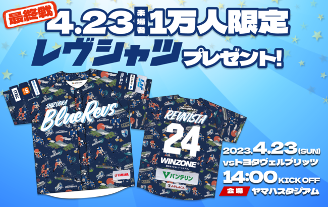 2023年4月23日(日) リーグ戦ホスト最終試合 トヨタヴェルブリッツ戦(14:00キックオフ/ヤマハスタジアム)にて、来場者プレゼントとして「レヴシャツ」を先着1万名様にプレゼントすることとなりましたのでお知らせいたします。
