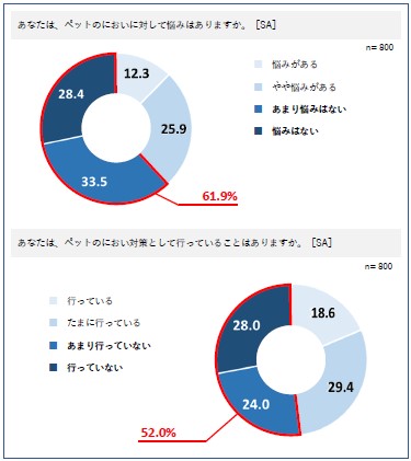 ペットにおいに対して「悩みはない」と28.4%、「あまり悩みはない」と回答した人が33.5%と季節に応じてにおいの強さを感じるが6割以上は悩みはないと回答。そのため、ペットのにおい対策を行っている人が48%で、行っていない人が52%とにおい対策に関して意見が割れる結果となりました。