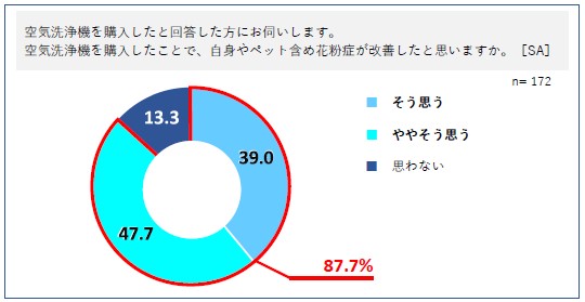 空気清浄機を購入した人のうち自身やペットの花粉症が改善したかの質問には「そう思う」39%、「ややそう思う」47.7%と回答し空気清浄機を購入すると約9割が花粉症に対する効果を実感していることが明らかになりました。