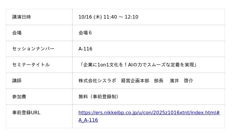 この度、2025年10月16日(木)~17日(金)に東京国際フォーラム ホールEで開催される「日経クロステックEXPO 2025」(主催:株式会社日経BP)に、AI 1on1ツール「InsightOne(インサイトワン)」をテーマに出展いたします。