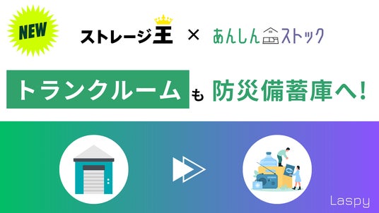 防災備蓄のワンストップサービスを提供する株式会社Laspy(東京都千代田区、代表取締役CEO 藪原拓人、以下「Laspy」)と、トランクルームに関する企画、開発、運営、管理業を行う株式会社ストレージ王(本社:千葉県市川市、代表取締役:荒川 滋郎、証券コード:2997、以下「ストレージ王」)は、新しい協業サービスを開始します。これにより、両社の強みを活かし、より安心で信頼性の高い防災備蓄サービスを提供します。