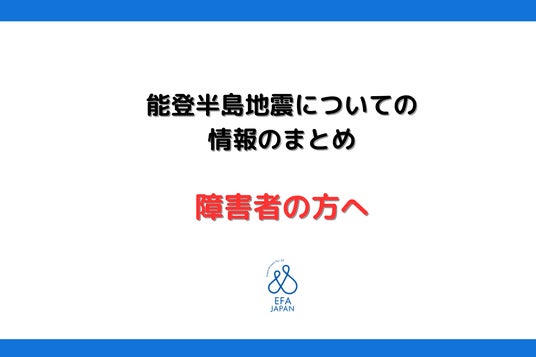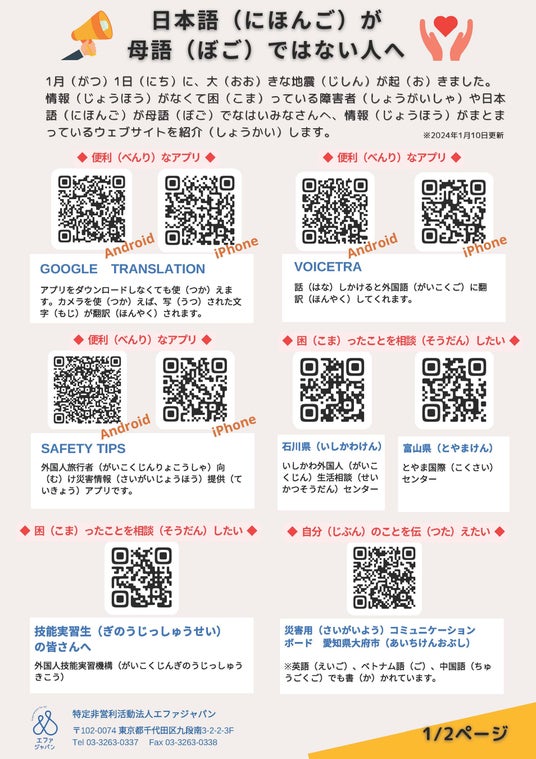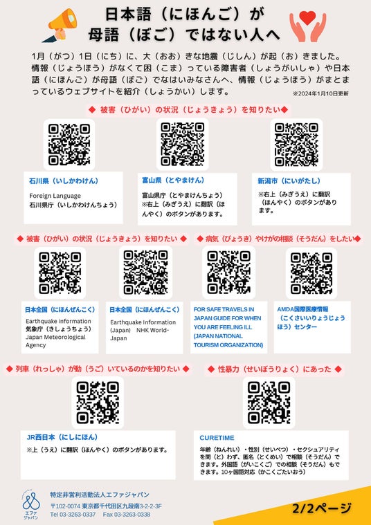 特定非営利活動法人エファジャパン(所在地 東京都千代田区/理事長 伊藤道雄/以下エファ)は、2024年1月1日に発生した令和6年能登半島地震の発生後、日本語が母語ではない方、また障害がある方向けに情報提供による支援を行っています。