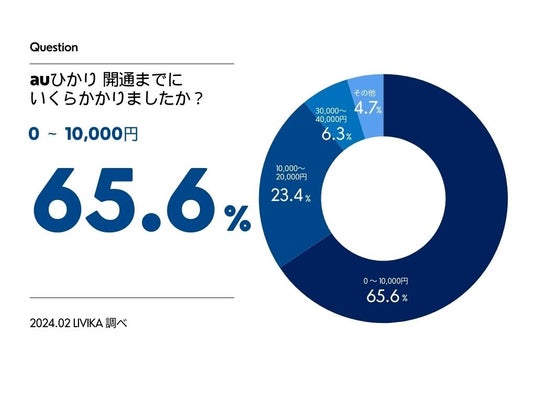 auひかりの開通にかかった費用について調査したところ、初期費用が「0~10,000円」が65.6%で、「10,000~20,000円」が23.4%となりました。