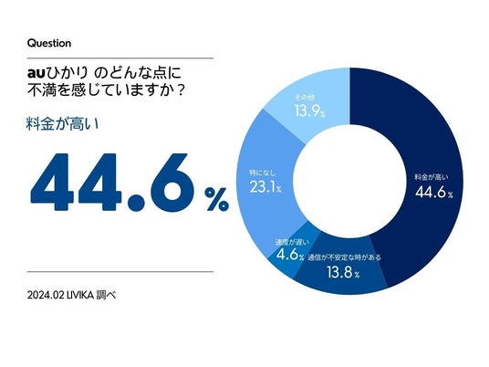 auひかりにおける不満の中で最も多い要因は、「料金が高いこと」であり、44.6%となりました。