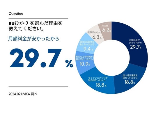 auひかりを選んだ理由で多かった回答は、「月額料金が安かったから」が29.7%、「速い通信速度を求めていたから」が18.8%、同様に「キャッシュバックが魅力的だった」が18.8%となっています。