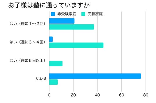 → 受験家庭では約9割が塾に通っている一方、非受験家庭では7割以上が通塾していない。