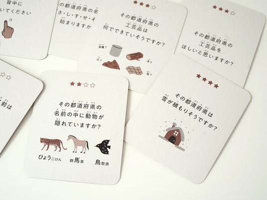質問はクスッと笑えるもの、想像力が広がるもの、ジェスチャーがおもしろいもの、日本全国の工芸品にまつわるものなどたくさん! 家族でゲームを楽しんでいるうちに自然と日本地図を覚えたり、日本の文化に興味が芽生えたりするかも。