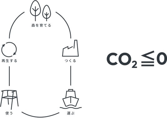 樹木はCO2を吸収し、木材としてかたちを変えても炭素を固定し続けます。その特性を活かし、森でCO2を吸収した木材を使うとともに、「つくる・運ぶ」工程での CO2排出量を抑制。さらに、不要になった家具の回収・リサイクルを含め、CO2の吸収量と排出量を差し引きゼロにします。