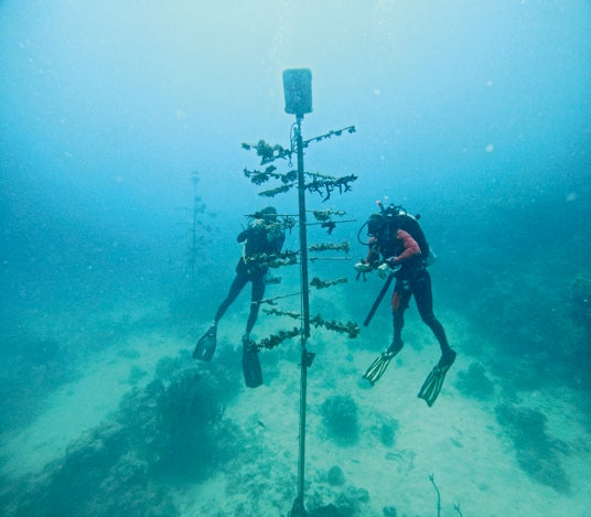 珊瑚をツリー状に育てる作業をするダイバー。目的は珊瑚の数10億の幼虫を自然環境に移植すること。