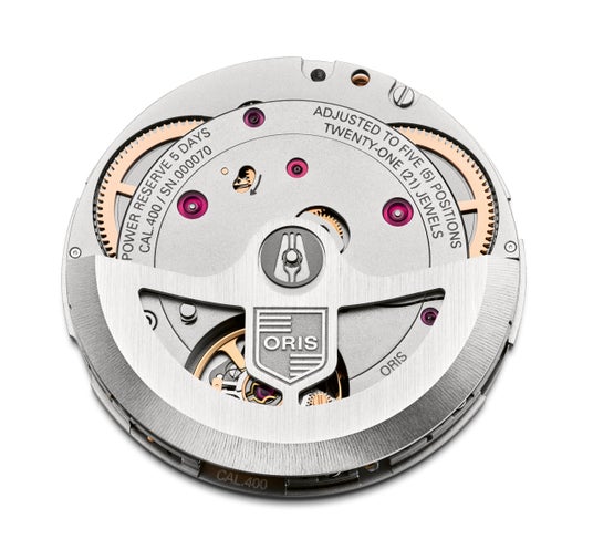 ムーブメントはオリスの画期的な自社開発自動巻、5日間パワーリザーブと高度な耐磁性を備えた、10年間メンテナンス不要のキャリバー400です。マイオリス登録で保証期間が10年に延長されます。