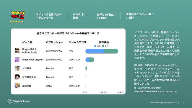 その他にも、ドラゴンボールIPモバイルゲームの海外収益がポケモンIPモバイルゲームに次いで高く、このゲームを代表する『ドラゴンボールZ ドッカンバトル』と『ドラゴンボール レジェンズ』は数年連続で海外における日本のモバイルIPゲーム収益ランキングで上位となっています。