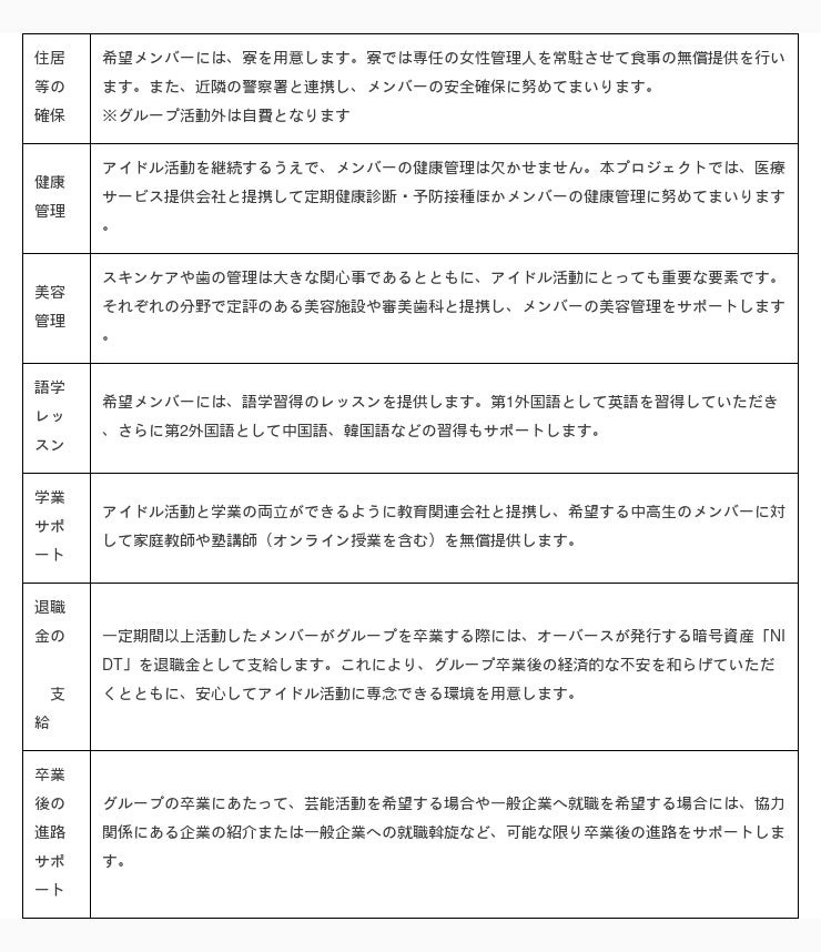 本プロジェクトは、オーバースが発行する暗号資産『Nippon Idol Token(以下「NIDT」)』による資金調達で実施。今後、NIDT保有者には、一部プロデュースへの参加や限定イベントへの招待、NFT配布などのさまざまな権利の付与を予定しています。完成されたアイドルグループを応援いただくのではなく、世界中から愛されるアイドルグループをファンの皆様とともに創っていきます。